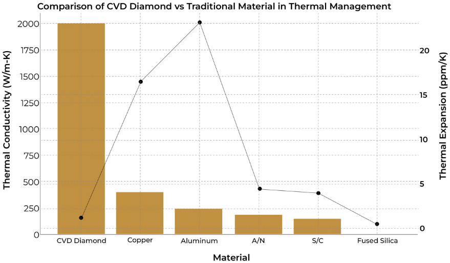 Diamond is the highest thermally conductive solid material known to man, outperforming copper, aluminum nitride, and even SiC by an order of magnitude. With QTG line of products, this property becomes scalable for advanced industrial and electronic use.